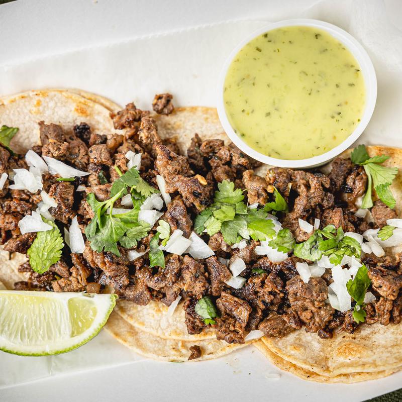 Grilled marinated skirt steak, double layer corn tortilla with cilantro and onions. Served with our guacamole salsa.